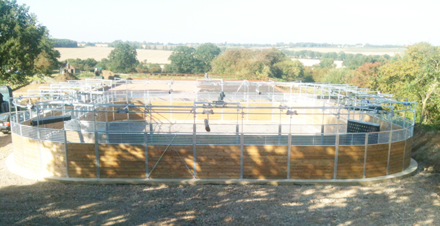 The square walkers can come with either partial or full roof or no roof as in the photograph. A 20m x 20m walker will easily accommodate 9 horses.